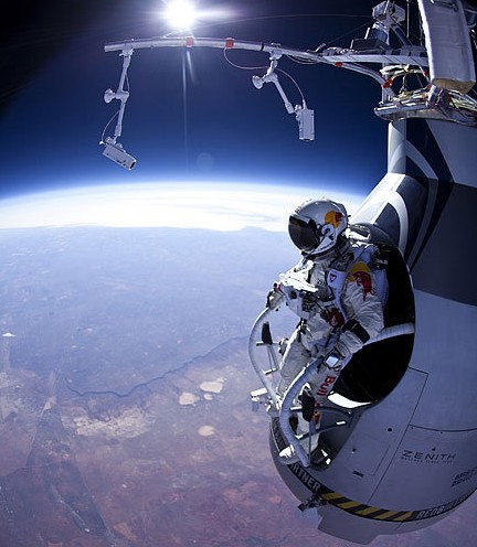 当地时间3月15日,美国罗斯威尔,高空极限跳伞运动员、奥地利人费利克斯-鲍姆加特纳,从21800米高空跳下并安全着陆,刷新世界最高跳伞纪录。图为鲍姆加特纳准备跳伞。