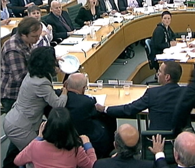 人民网7月20日讯 在19日英国议会的听证会上,一男子将剃须膏扔向默多克使得现场秩序一片混乱,十几分钟后,默多克回到了现场继续回答议员的提问。