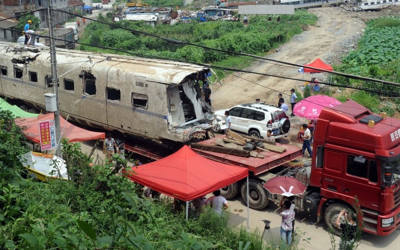 7月26日,载重车装载事故车准备离开现场。 经国务院“7·23”甬温线特别重大铁路交通事故调查组研究决定,相关部门将遗留在现场的事故车辆移送至温州西站,作进一步调查处理。 新华社记者 徐昱 摄