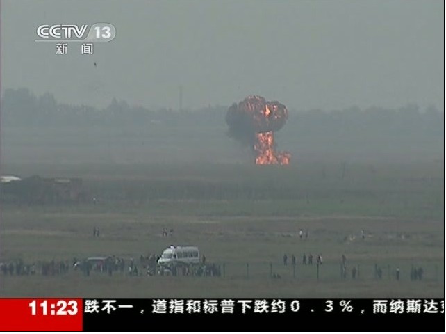 14日上午,2011中国国际通用航空大会在陕西蒲城举行飞行表演时,一架飞豹战机出现意外坠机,人员伤亡不详,目击者看到有人跳伞。