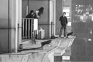 “听说还是个孕妇,怀孕7个月了!”据知情者透露。下午1点多时,有人看到她挺个大肚子进了电梯,当时物业发现她好像不是这边的住户,就跟随着问她,结果就看到她爬到楼顶的平台,而且踩着东西翻过了平台边缘的栏杆,站到了平台外面。而平台只有一米来宽,这给施救也带来了不少的难度,记者当时看到,民警一直没有越过栏杆,而是在栏杆外侧试图和她沟通。