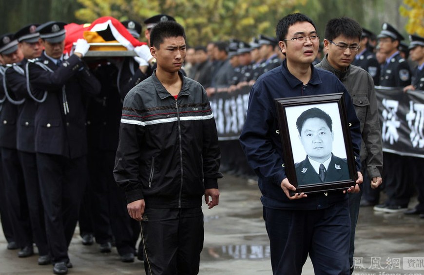2011年11月4日,山东省沂水县公安局的民警和当地群众列队迎接赴吉林追逃时牺牲的副所长民警王增强魂归故里。大众日报/文 朱武涛/摄